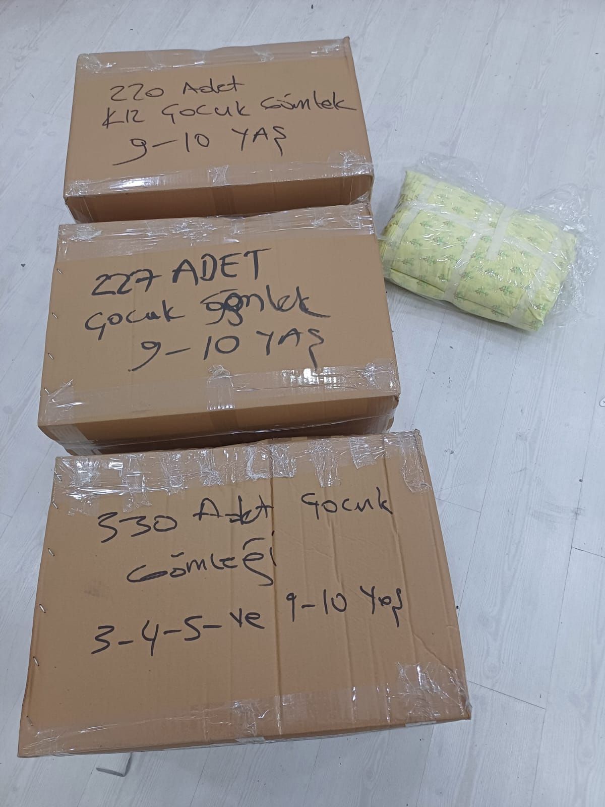 KIZ 125 ADET 3/5 YAŞ 125 ADET 3/5 YAŞ ERKEK 125 ADET 9 YAŞ KIZ 125 ADET 9 YAŞ ERKEK 125 ADET 10 YAŞ KIZ 125 ADET 10 YAŞ ERKEK TOPLAM TEK RENK 750 ADET GÖMLEK HEPSİ TEMİZ SORUNSUZ PAKETTE
